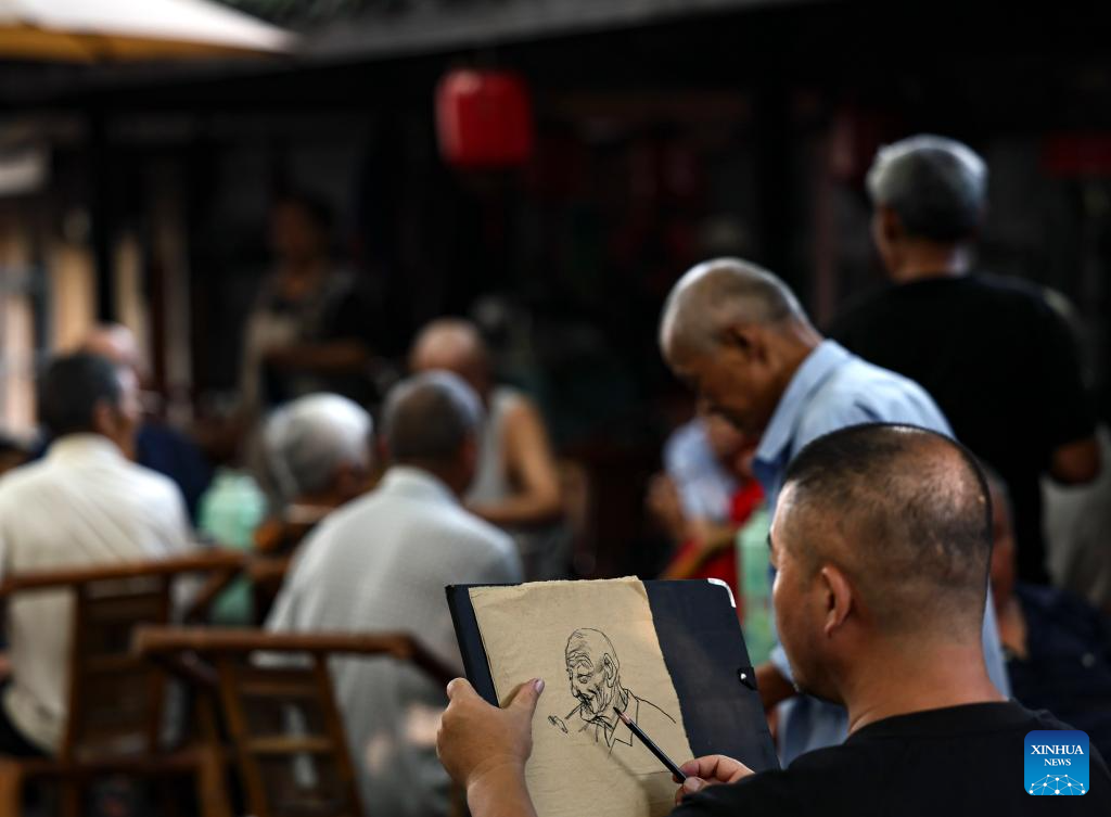 A painter draws a portrait of a senior citizen at Guanyinge teahouse in Shuangliu District of Chengdu, capital of southwest China's Sichuan Province, Aug. 7, 2023. Guanyinge, located on a riverside at an ancient street in Shuangliu District of Chengdu, is a teahouse with a history of more than one hundred years.