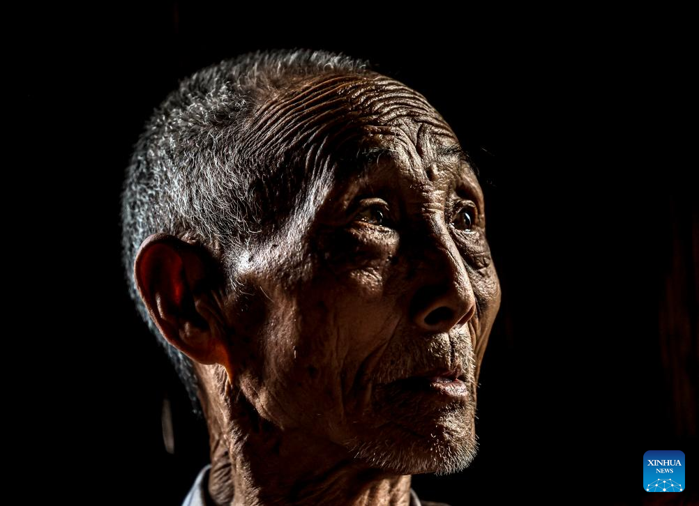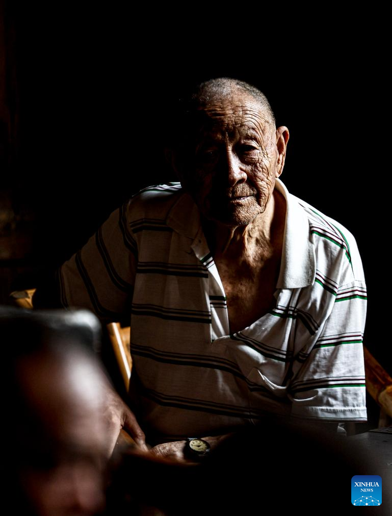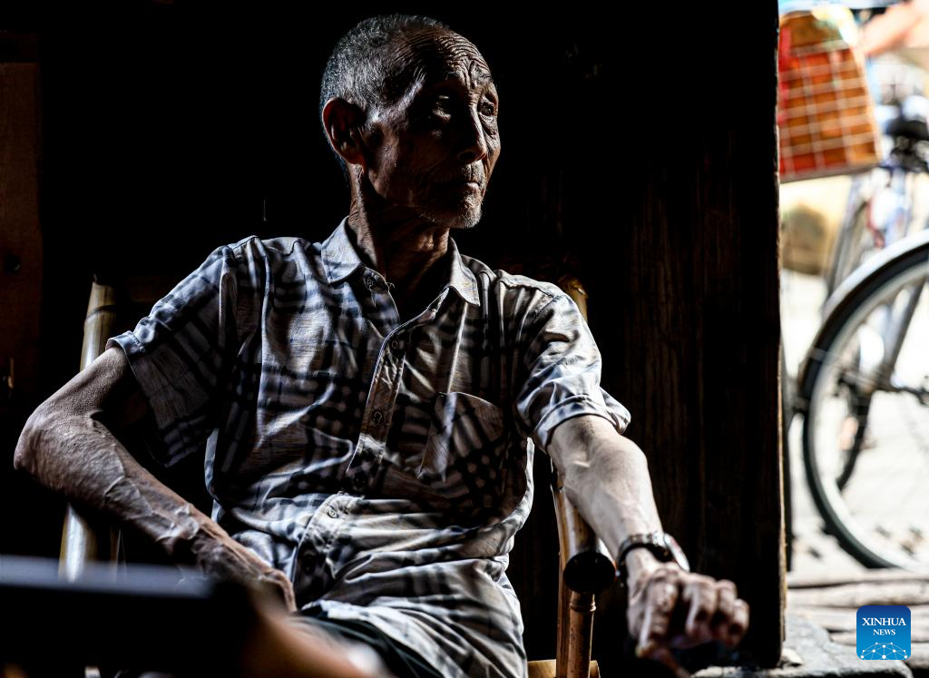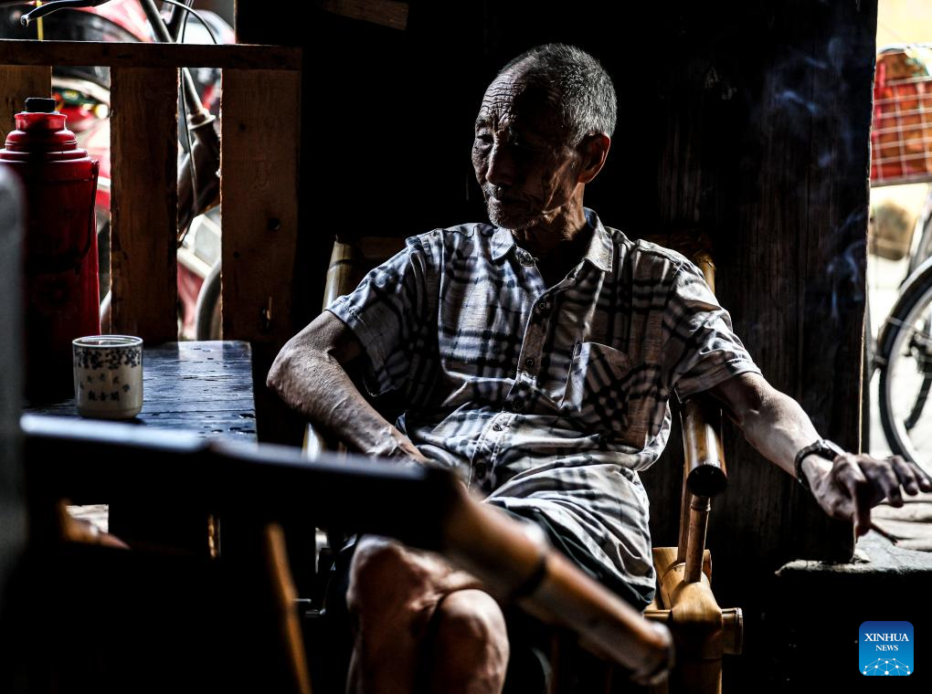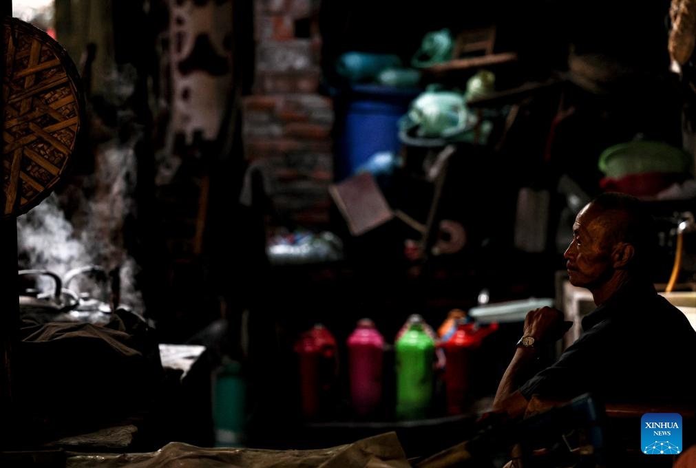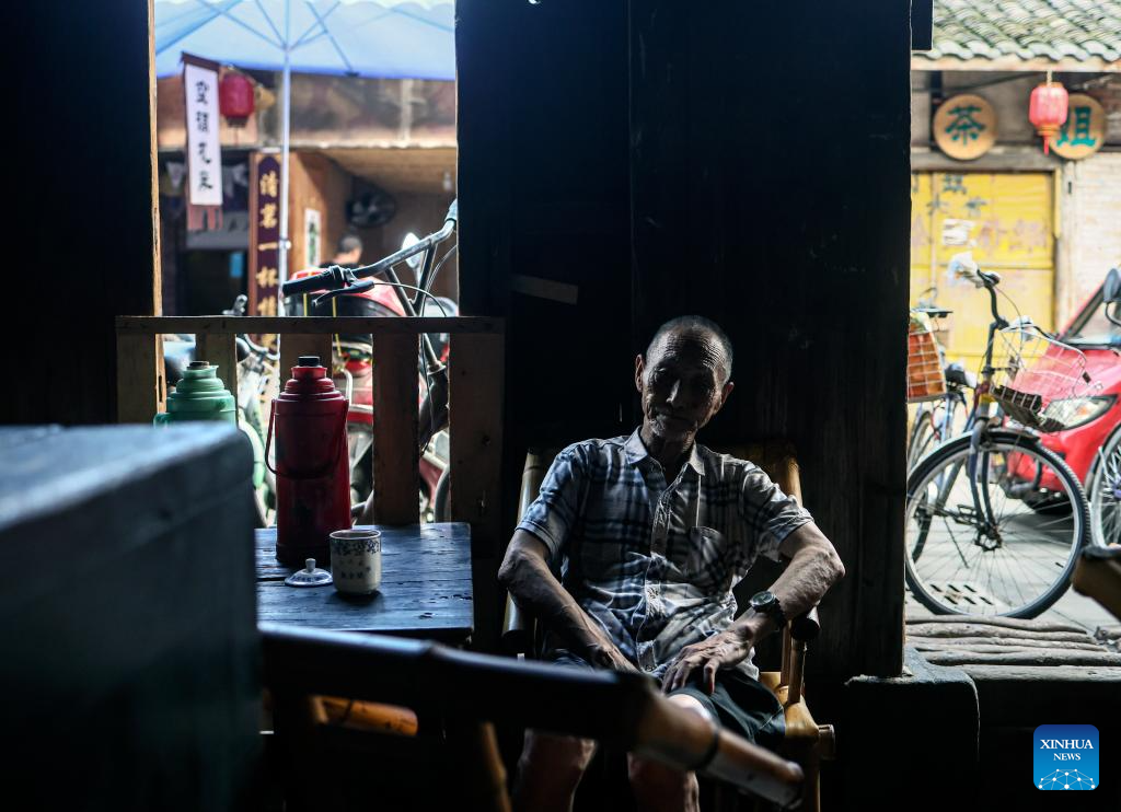 A senior citizen enjoys his leisure time at Guanyinge teahouse in Shuangliu District of Chengdu, capital of southwest China's Sichuan Province, Aug. 7, 2023. Guanyinge, located on a riverside at an ancient street in Shuangliu District of Chengdu, is a teahouse with a history of more than one hundred years.