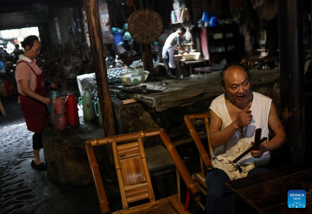 A local Chinese folk artist performs at Guanyinge teahouse in Shuangliu District of Chengdu, capital of southwest China's Sichuan Province, Aug. 7, 2023. Guanyinge, located on a riverside at an ancient street in Shuangliu District of Chengdu, is a teahouse with a history of more than one hundred years.