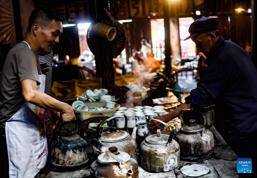 A waiter works at Guanyinge teahouse in Shuangliu District of Chengdu, capital of southwest China's Sichuan Province, Aug. 7, 2023. Guanyinge, located on a riverside at an ancient street in Shuangliu District of Chengdu, is a teahouse with a history of more than one hundred years.
