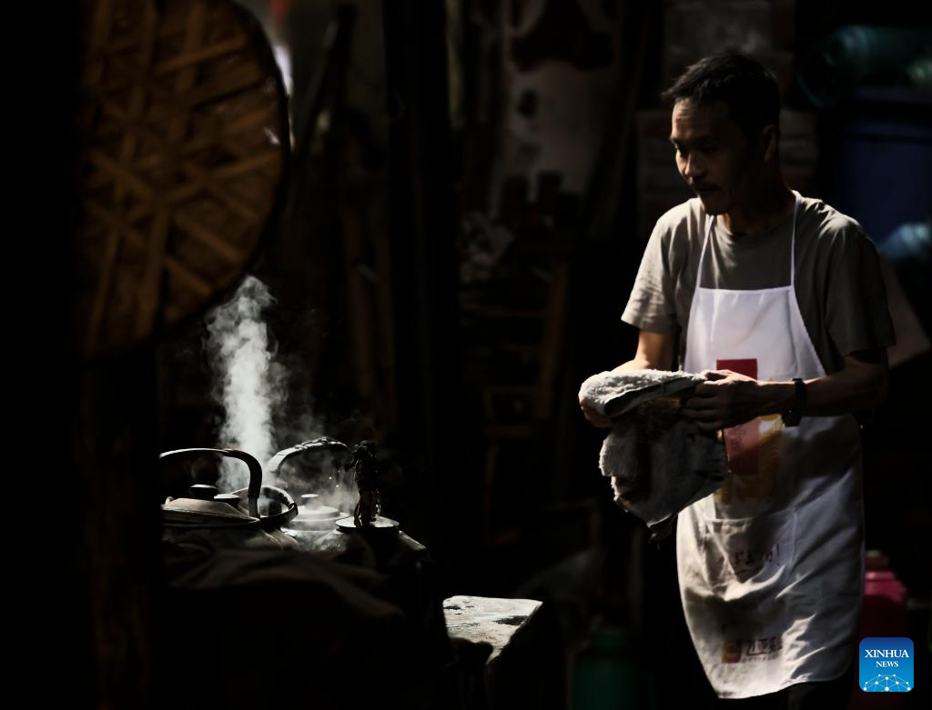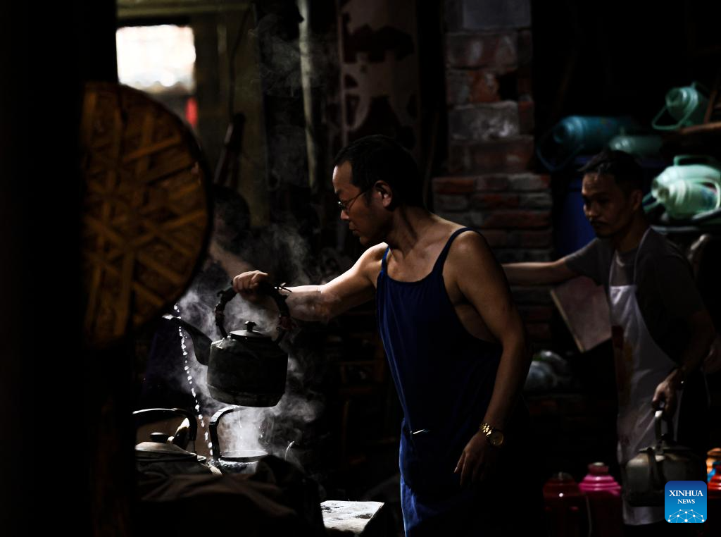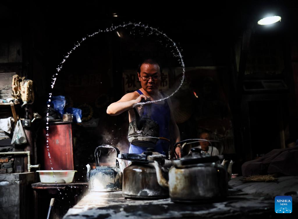 A waiter boils water at Guanyinge teahouse in Shuangliu District of Chengdu, capital of southwest China's Sichuan Province, Aug. 7, 2023. Guanyinge, located on a riverside at an ancient street in Shuangliu District of Chengdu, is a teahouse with a history of more than one hundred years.