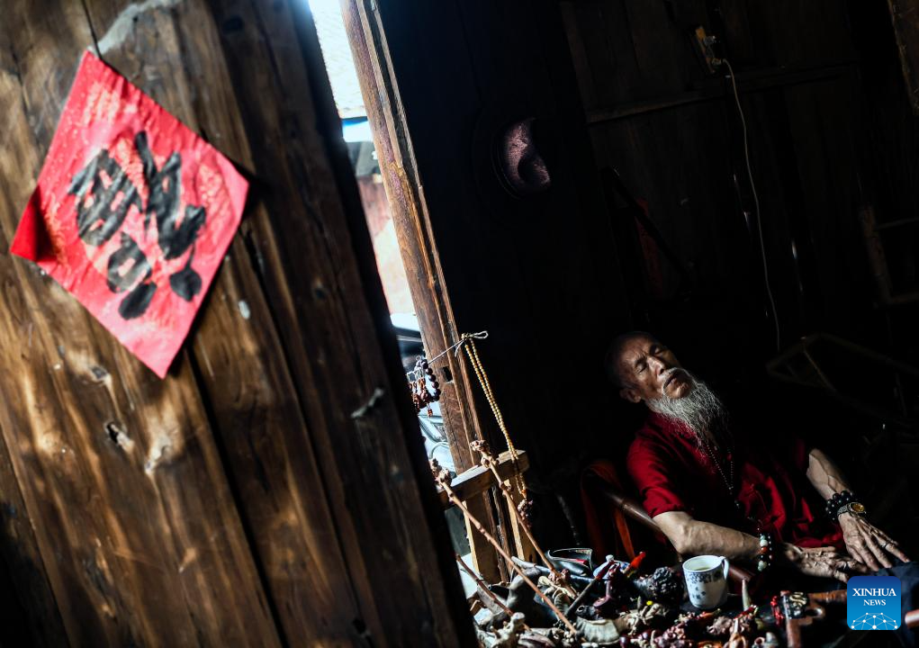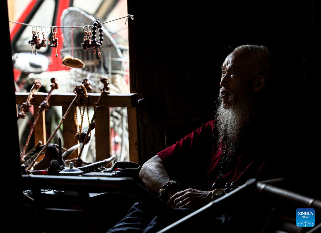 A senior citizen sells handicraft products at Guanyinge teahouse in Shuangliu District of Chengdu, capital of southwest China's Sichuan Province, Aug. 7, 2023. Guanyinge, located on a riverside at an ancient street in Shuangliu District of Chengdu, is a teahouse with a history of more than one hundred years.