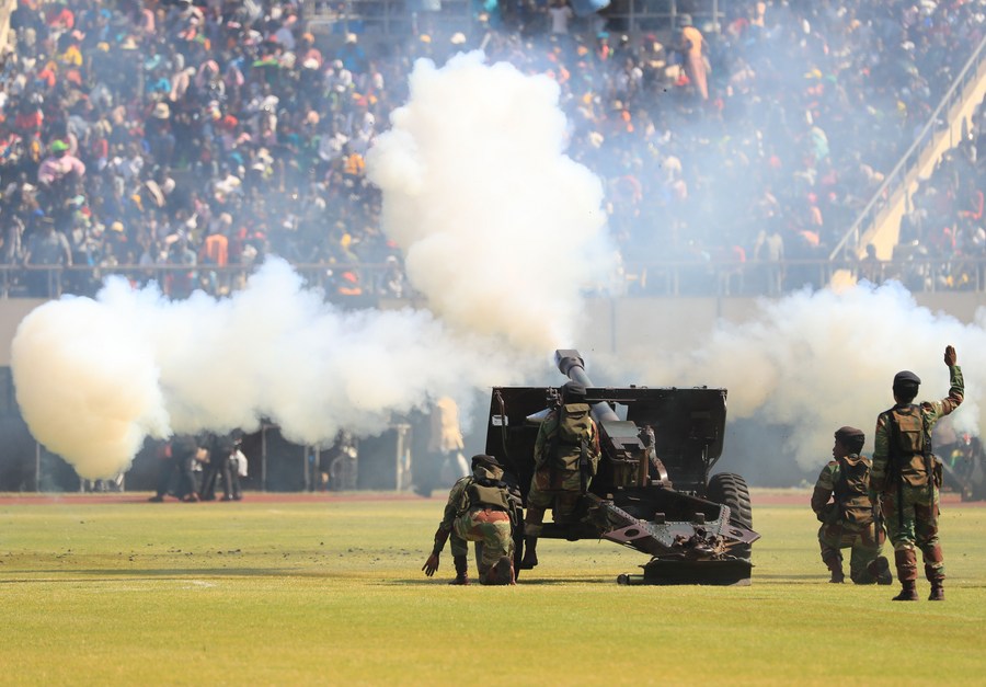 Members of the Zimbabwe Defense Forces perform armory display during the 43rd Zimbabwe Defense Forces celebrations at the National Sports Stadium in Harare, Zimbabwe, Aug. 15, 2023. (Photo by Shaun Jusa/Xinhua)