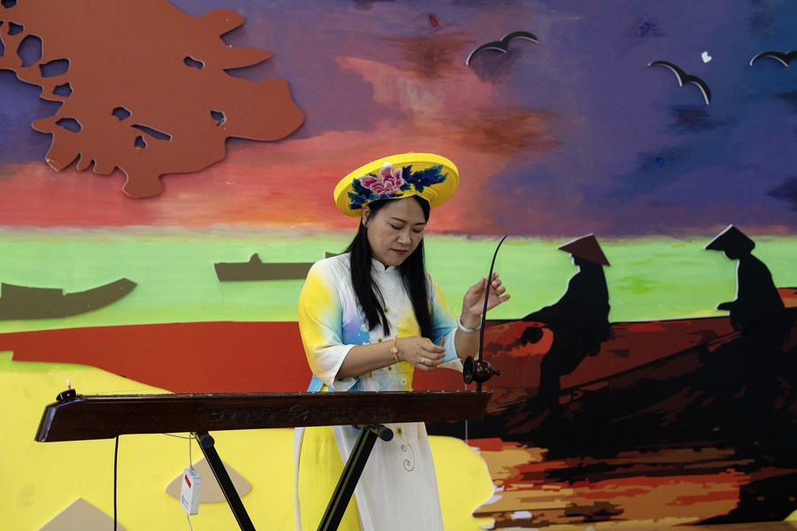 Su Haizhen, head of a museum of the Jing ethnic group and an inheritor of the art of the single-stringed instrument of the Jing ethnic group, plays for visitors at her museum, in Dongxing, south China's Guangxi Zhuang Autonomous Region, Aug. 13, 2023. (Xinhua/Fei Maohua)