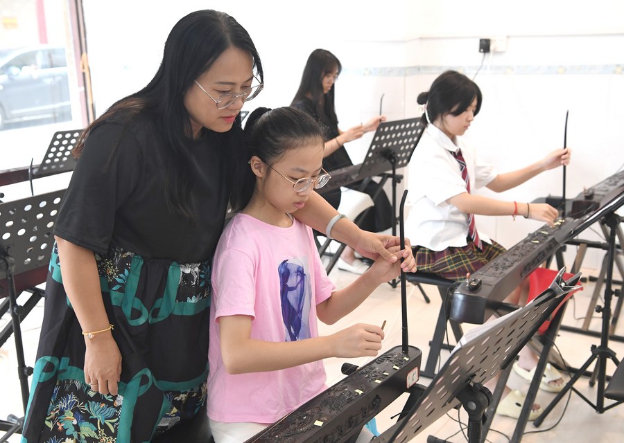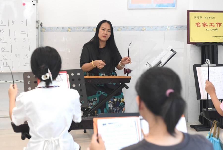 Su Haizhen, head of a museum of the Jing ethnic group and an inheritor of the art of the single-stringed instrument of the Jing ethnic group, directs her students during their practice, in Dongxing, south China's Guangxi Zhuang Autonomous Region, Aug. 13, 2023. (Xinhua/Fei Maohua)