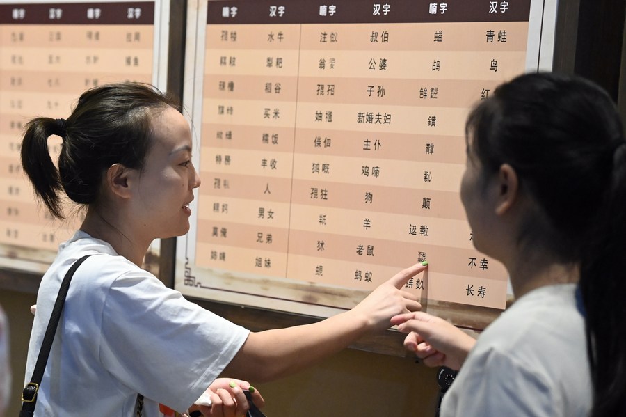 A visitor learns characters of the Jing ethnic group at a museum of the Jing ethnic group in Dongxing, south China's Guangxi Zhuang Autonomous Region, Aug. 13, 2023. (Xinhua/Zhang Ailin)