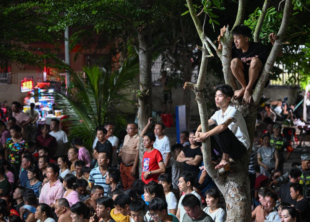 Spectators try to catch a volleyball before a village volleyball match in Wenchang, south China's Hainan Province, Aug. 13, 2023. (Xinhua/Pu Xiaoxu)