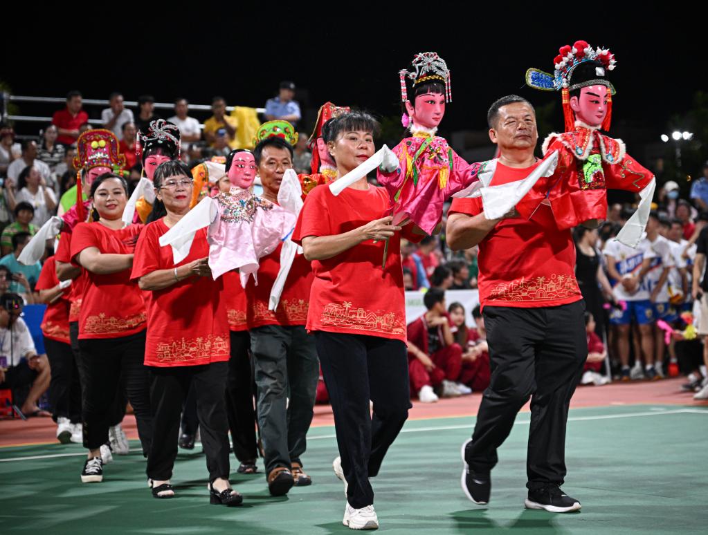 Local artists perform prior to a village volleyball match in Wenchang, south China's Hainan Province, Aug. 13, 2023. (Xinhua/Pu Xiaoxu)