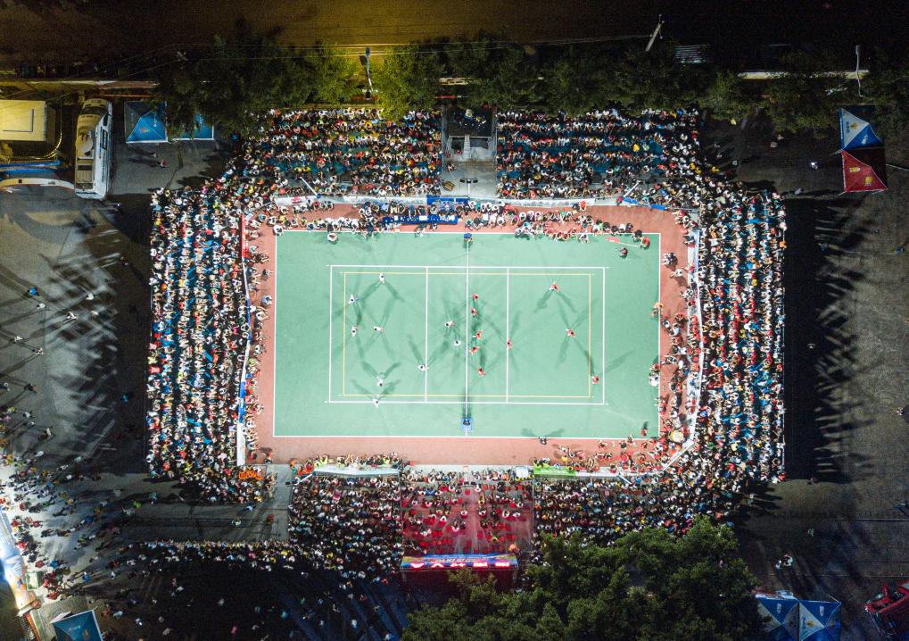 The aerial photo taken on July 23, 2023 shows that people watch a village volleyball match in Wenchang, south China's Hainan Province. (Xinhua/Pu Xiaoxu)