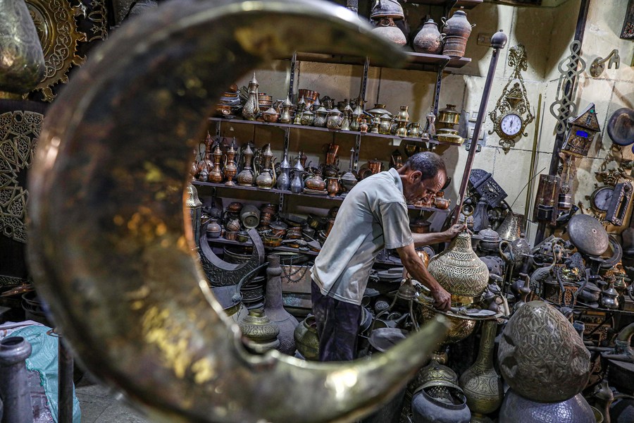 A shopkeeper arranges copper works at his shop in Cairo, Egypt, on Aug. 13, 2023. (Xinhua/Ahmed Gomaa)