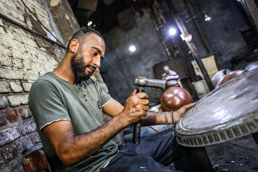 A coppersmith beats a copper sheet to make a vessel at a workshop in Cairo, Egypt, on Aug. 13, 2023. (Xinhua/Ahmed Gomaa)