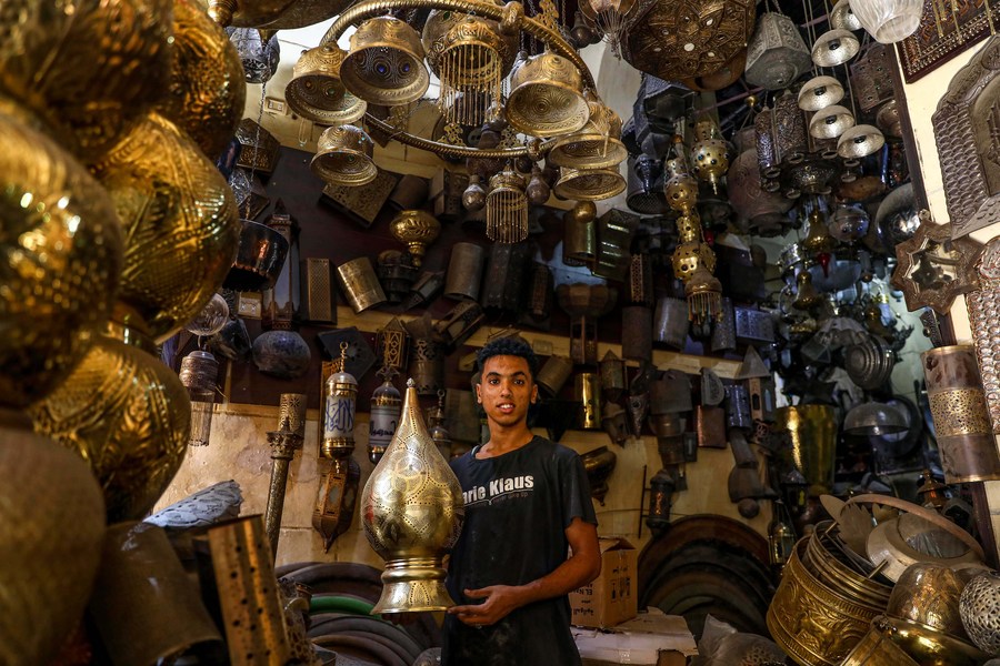 A man shows copper works at his shop in Cairo, Egypt, on Aug. 13, 2023. (Xinhua/Ahmed Gomaa)