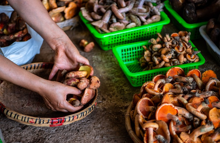 A vendor arranges edible wild mushrooms for sell at a wild mushroom trade market in Kunming, southwest China's Yunnan Province, July 2, 2023. (Xinhua/Jiang Wenyao)
