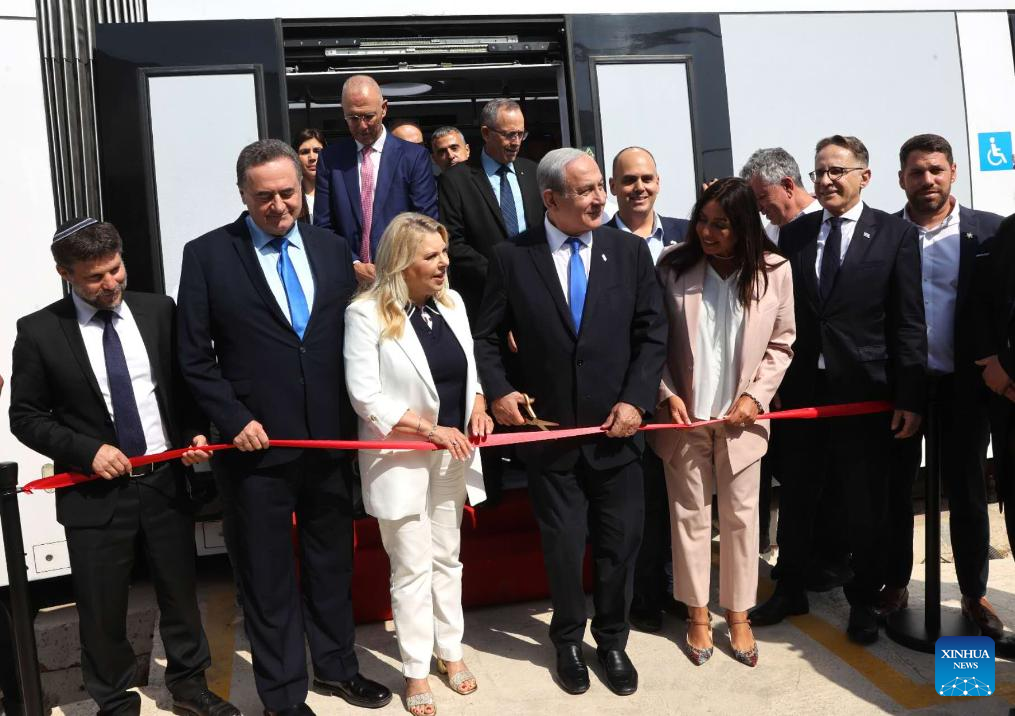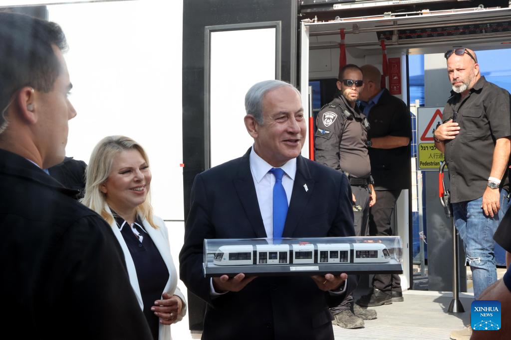 In the ceremony at the Kiryat Aryeh operational center in Petah Tikvah city, north of Tel Aviv, Israeli Prime Minister Benjamin Netanyahu snipped a red ribbon at a rail station entrance.