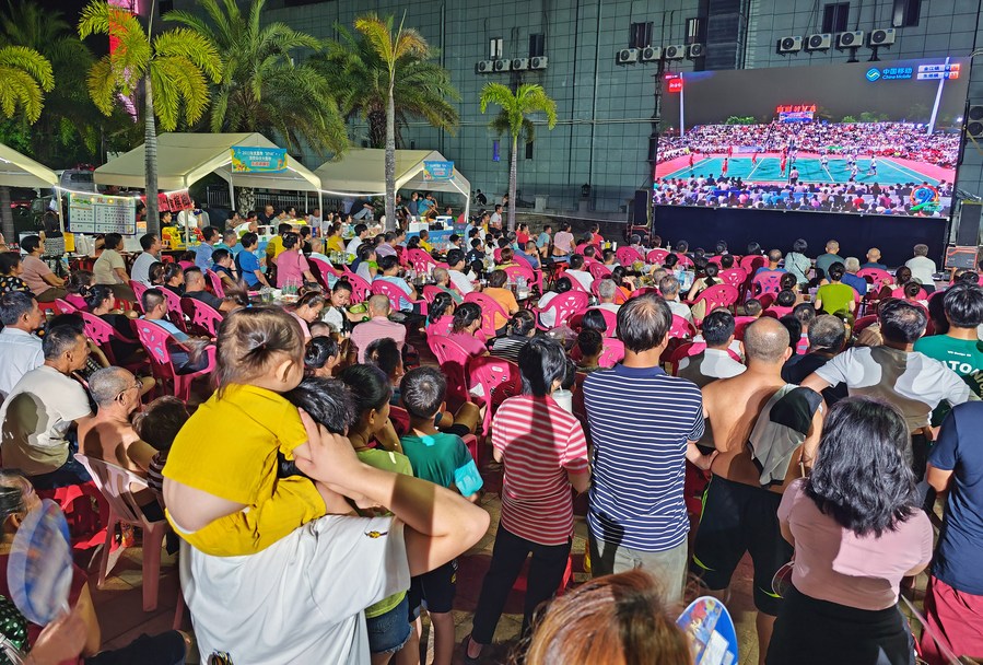 People watch a volleyball match on a big screen outside a volleyball court in Wenchang, south China's Hainan Province, Aug. 5, 2023. (Xinhua/Guo Cheng)