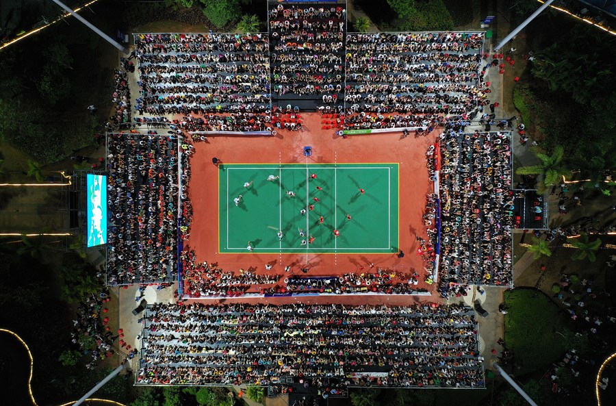 This aerial photo taken on Aug. 6, 2023 shows a volleyball match held in Wenchang, south China's Hainan Province. (Xinhua/Guo Cheng)