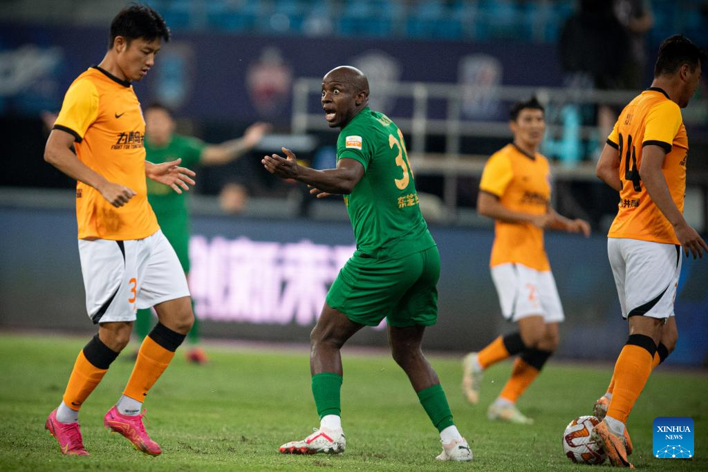 Felicio Brown Forbes (L) of Qingdao Hainiu competes during 2023 season Chinese Football Association Super League (CSL) 23rd round match between Zhejiang FC and Qingdao Hainiu in Huzhou, east China's Zhejiang Province, Aug. 18, 2023. (Xinhua/Jiang Han)