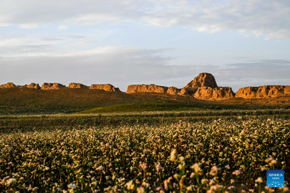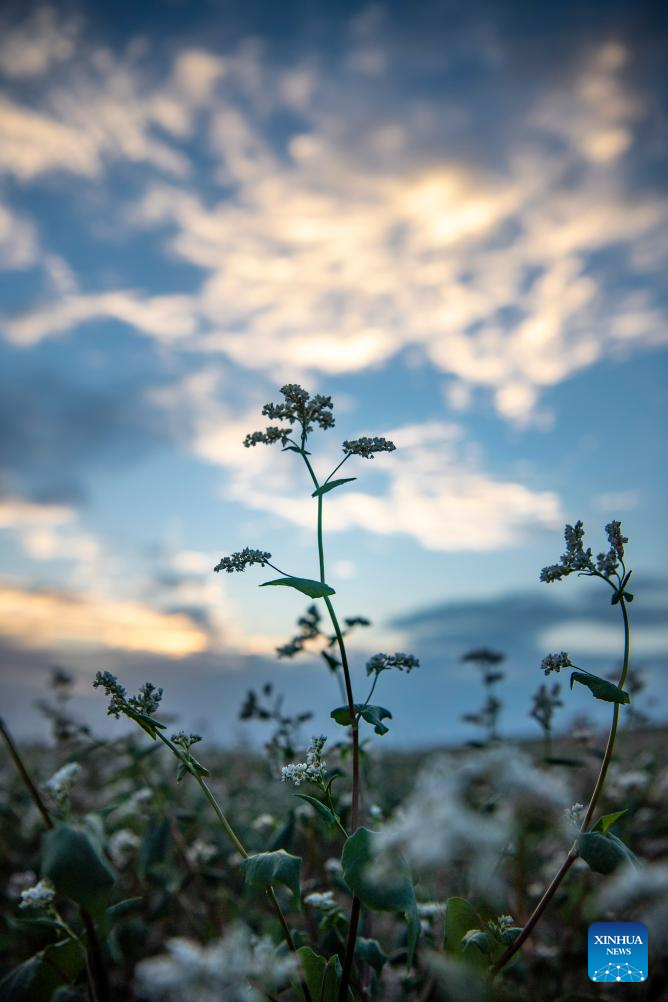 This photo taken on Aug. 18, 2023 shows blooming buckwheat flowers in Yanchi County, northwest China's Ningxia Hui Autonomous Region. With a total cultivation area of 661,000 mu (about 44,067 hectares) this year, buckwheat in Yanchi County is in full blossom. (Xinhua/Liu Jinhai)