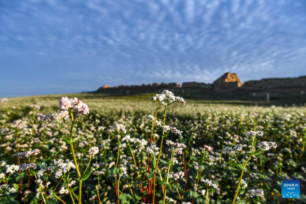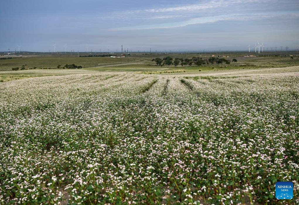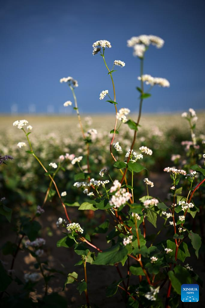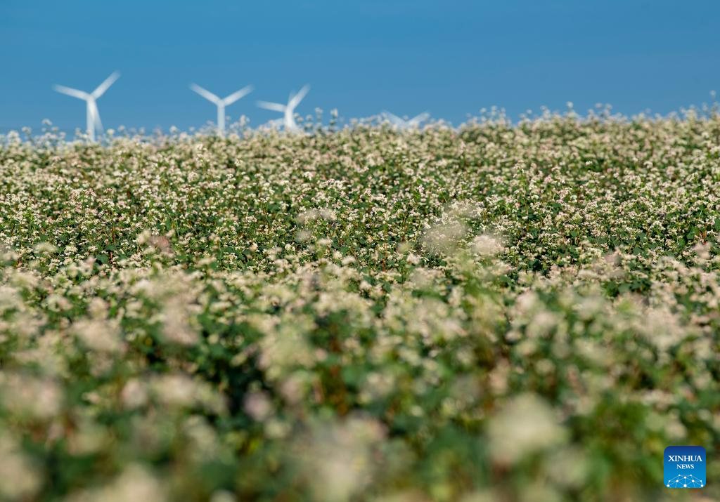 This photo taken on Aug. 18, 2023 shows blooming buckwheat flowers in Yanchi County, northwest China's Ningxia Hui Autonomous Region. With a total cultivation area of 661,000 mu (about 44,067 hectares) this year, buckwheat in Yanchi County is in full blossom. (Xinhua/Wang Peng)