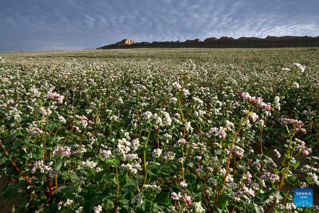 This photo taken on Aug. 18, 2023 shows blooming buckwheat flowers in Yanchi County, northwest China's Ningxia Hui Autonomous Region. With a total cultivation area of 661,000 mu (about 44,067 hectares) this year, buckwheat in Yanchi County is in full blossom. (Xinhua/Lian Zhen)