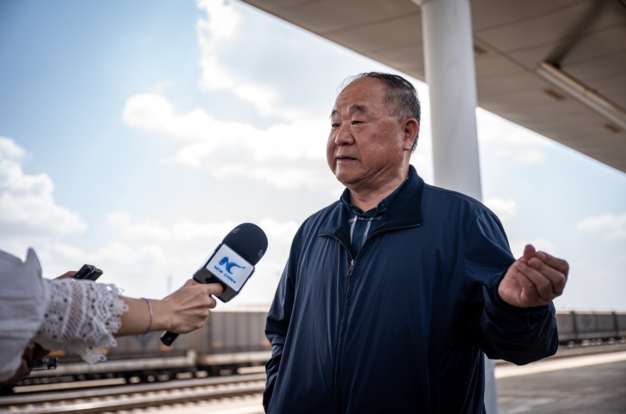 Mo Yan speaks during an interview with Xinhua at the Nairobi Station of the Mombasa-Nairobi Standard Gauge Railway in Nairobi, Kenya, Aug. 13, 2023. (Xinhua/Wang Guansen)