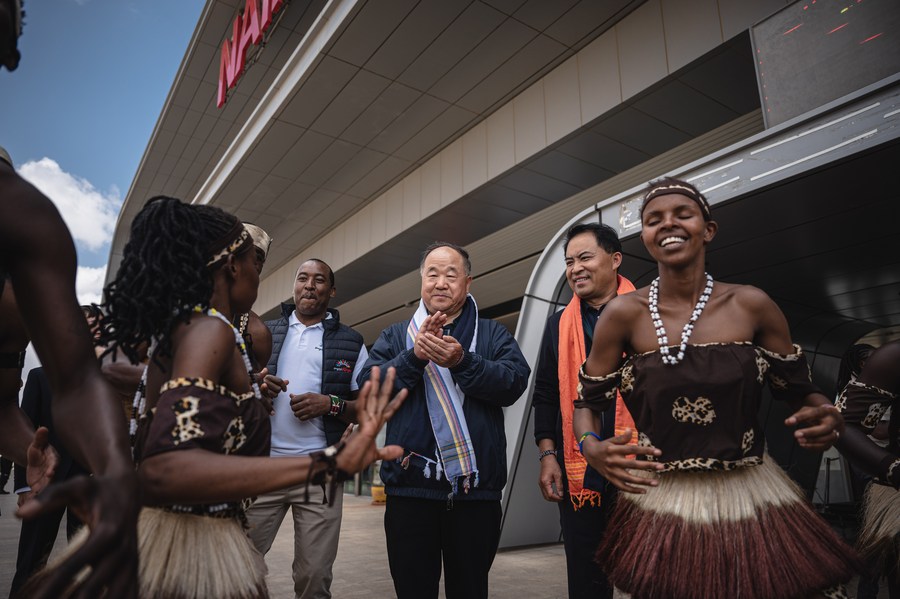 Mo Yan (1st R) interacts with performers at the Nairobi Station of the Mombasa-Nairobi Standard Gauge Railway in Nairobi, Kenya, Aug. 13, 2023. (Xinhua/Wang Guansen)