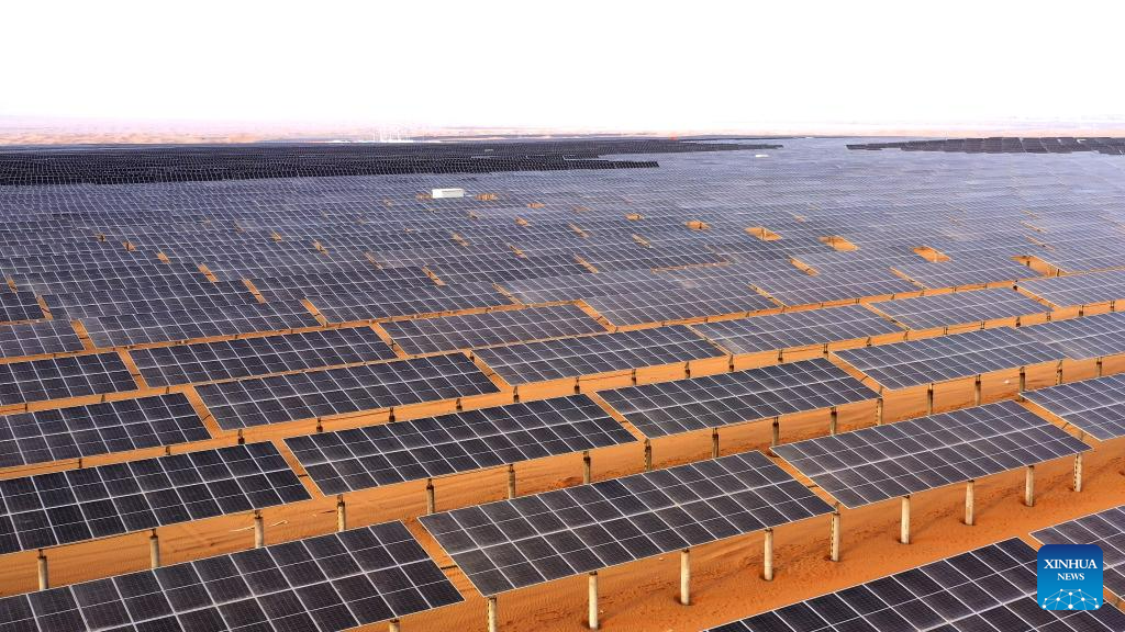This photo taken on April 16, 2023 shows a photovoltaic base on the Tengger Desert in Zhongwei City, northwest China's Ningxia Hui Autonomous Region. (Xinhua)