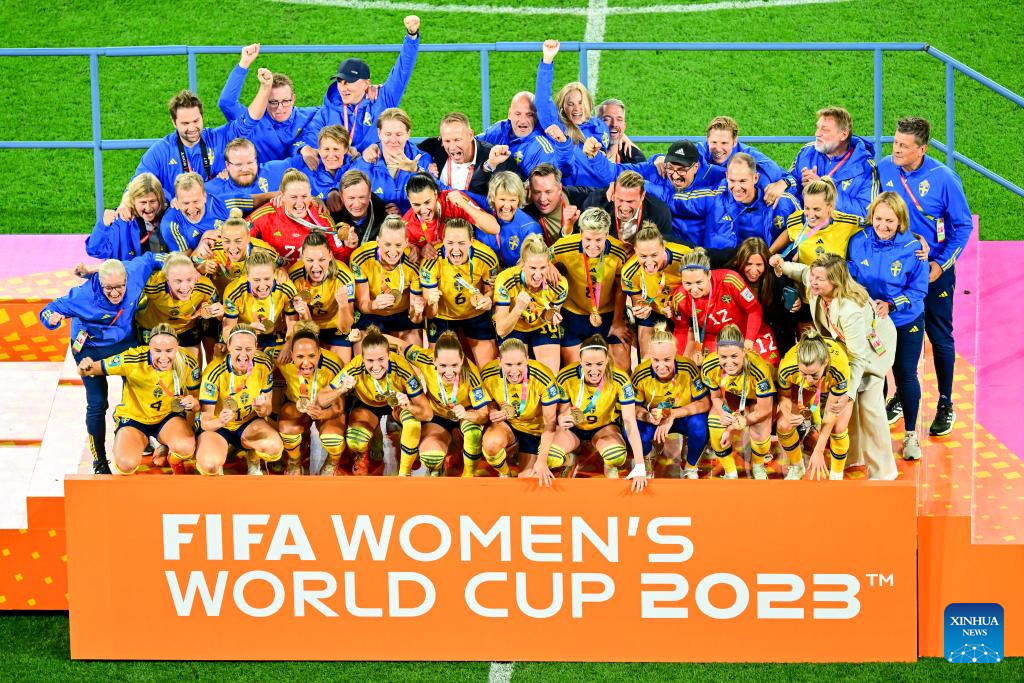 Team Sweden celebrate during the awarding ceremony of the third place play-off at the 2023 FIFA Women's World Cup in Brisbane, Australia, Aug. 19, 2023. (Xinhua/Zhu Wei)