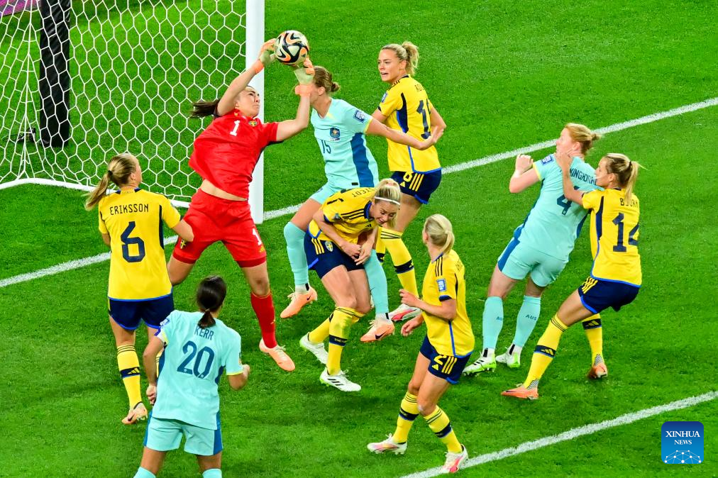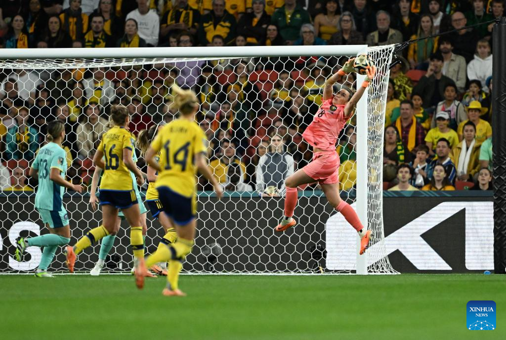 Australia's goalkeeper Mackenzie Arnold (1st R) makes a save during the third place play-off between Sweden and Australia at the 2023 FIFA Women's World Cup in Brisbane, Australia, Aug. 19, 2023. (Xinhua/Li Yibo)