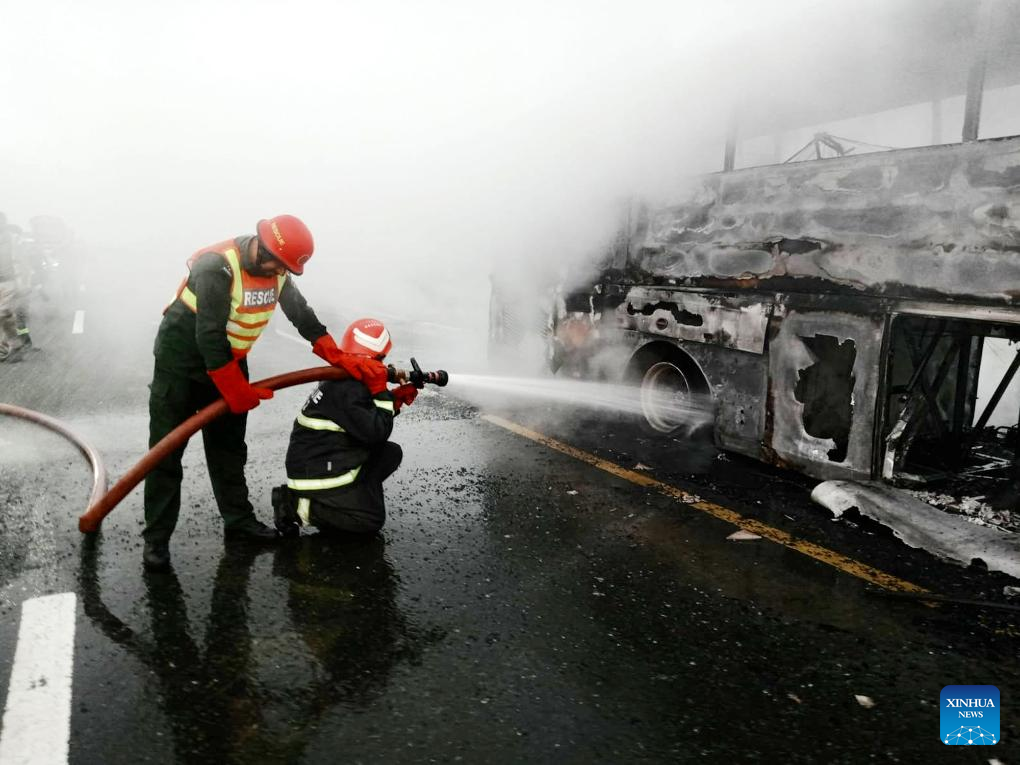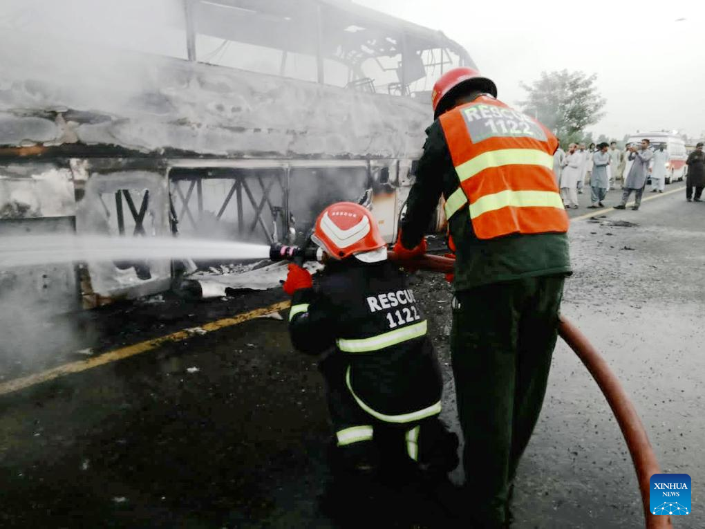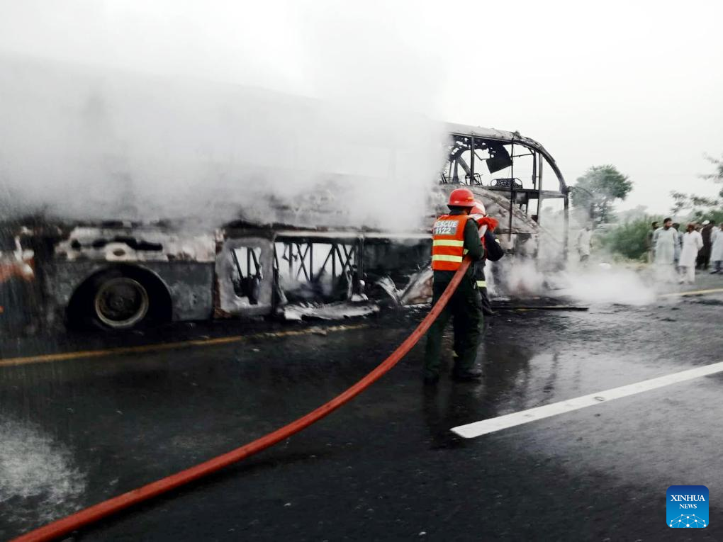 Rescuers put out fire at the site of the accident in Hafizabad district of Pakistan's eastern Punjab province, Aug. 20, 2023. At least 20 people were burnt to death and 15 others injured on Sunday after a passenger bus hit a vehicle and caught fire in Hafizabad district of Pakistan's eastern Punjab province, the rescue and health officials reported. (Pakistan's Rescue 1122/Handout via Xinhua)