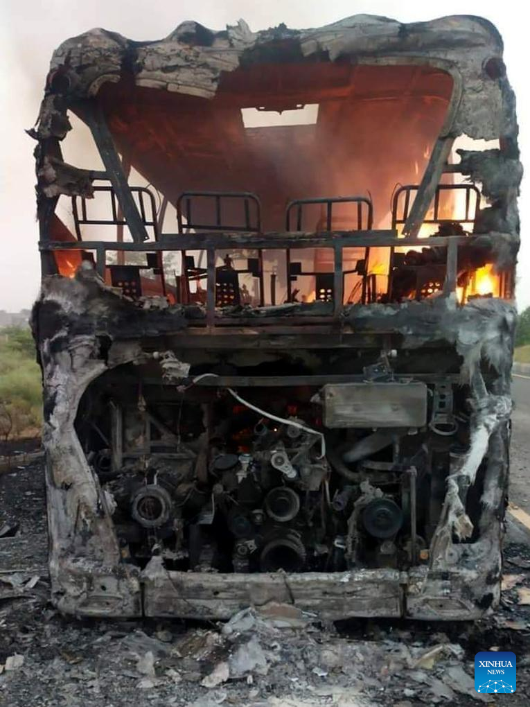 ISLAMABAD, Aug. 20 (Xinhua) -- At least 20 people were burnt to death and 15 others injured on Sunday after a passenger bus hit a vehicle and caught fire in Hafizabad district of Pakistan's eastern Punjab province, the rescue and health officials reported.