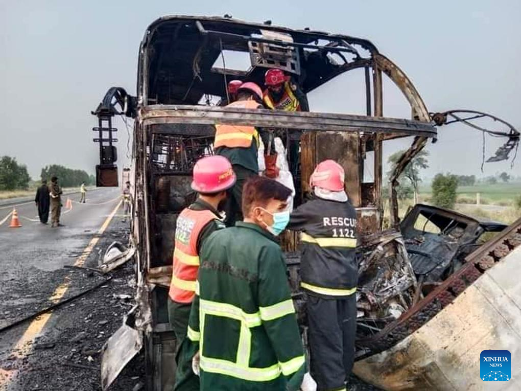This photo taken with a mobile phone shows rescuers working at the site of the accident in Hafizabad district of Pakistan's eastern Punjab province on Aug. 20, 2023. At least 20 people were burnt to death and 15 others injured on Sunday after a passenger bus hit a vehicle and caught fire in Hafizabad district of Pakistan's eastern Punjab province, the rescue and health officials reported. (Str/Xinhua)