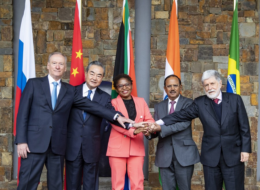 Wang Yi (2nd L), a member of the Political Bureau of the Communist Party of China (CPC) Central Committee and director of the Office of the CPC Central Commission for Foreign Affairs, poses for a group photo with Khumbudzo Ntshavheni (C), minister in the Presidency of South Africa, Celso Luiz Nunes Amorim (1st R), chief adviser of the Presidency of Brazil, Nikolai Patrushev (1st L), secretary of the Security Council of Russia, and National Security Adviser of India Ajit Doval (2nd R) at the 13th Meeting of BRICS National Security Advisers and High Representatives on National Security in Johannesburg, South Africa, July 25, 2023. (Xinhua/Zhang Yudong)
