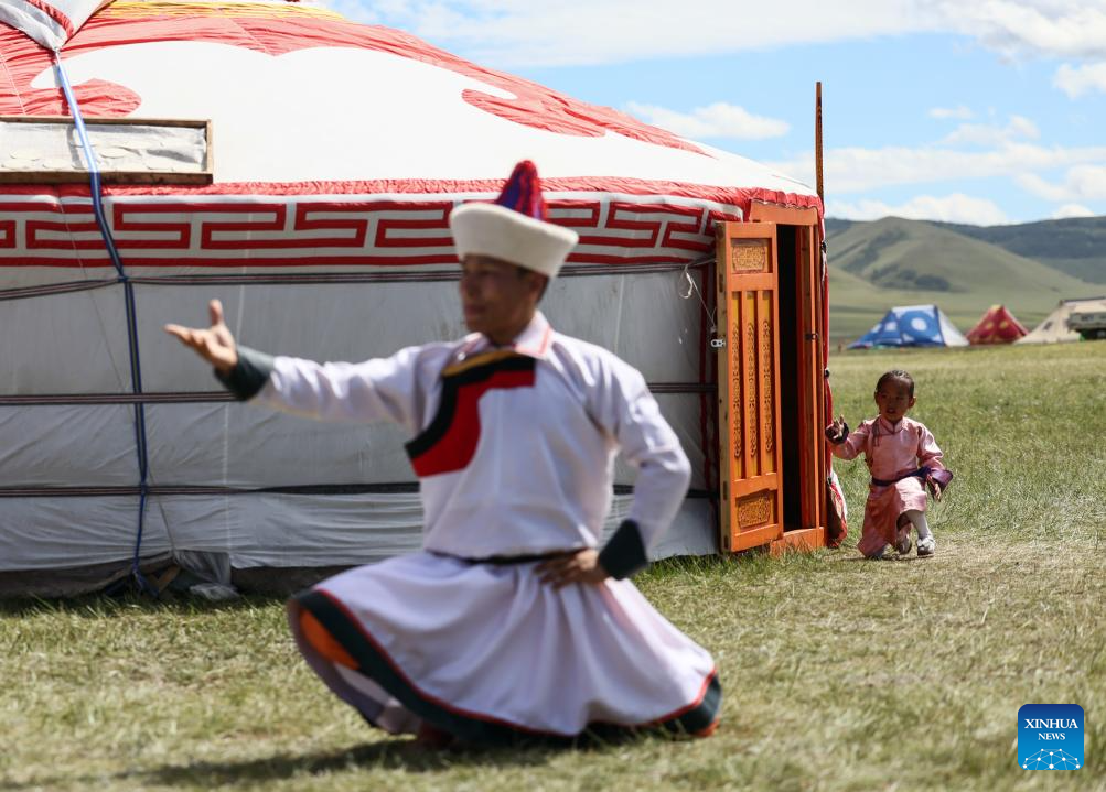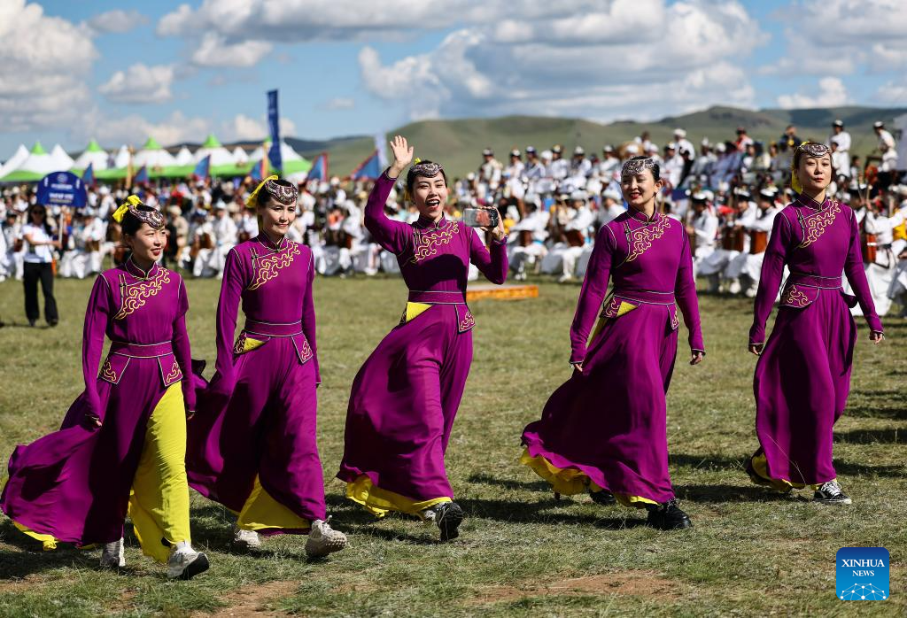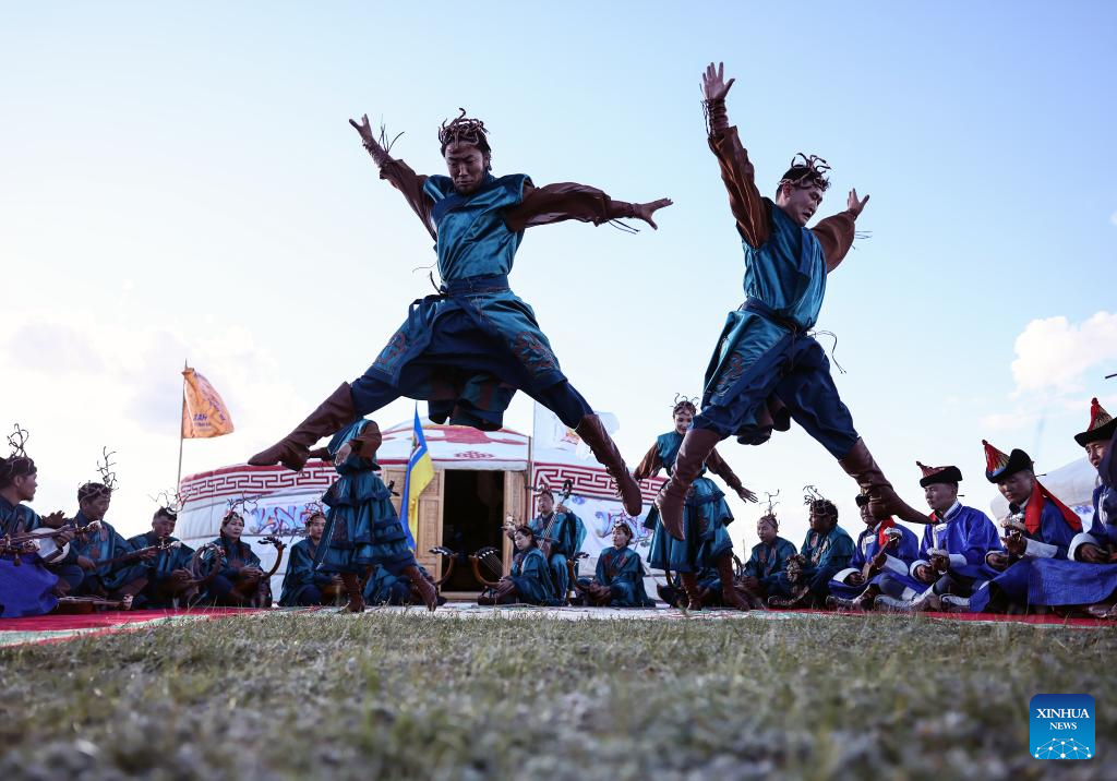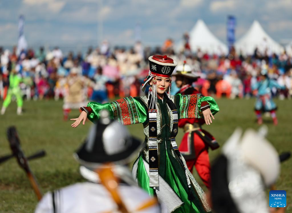 Dancers perform at a cultural festival in the Nalaikh District of Ulan Bator, Mongolia, on Aug. 18, 2023. A cultural festival to promote Mongolia's nomadic intangible culture and the development of the tourism sector kicked off here on Friday.