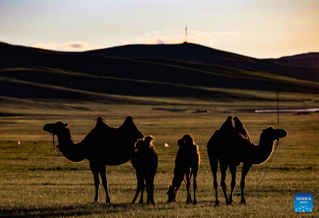 Camels are pictured at sunset in the Nalaikh District of Ulan Bator, Mongolia, on Aug. 18, 2023. The Nalaikh District, the venue of a cultural festival to promote Mongolia's nomadic intangible culture and the development of the tourism sector, returns to its natural tranquility as the day-time events concluded at sunset. Some participants choose to stay put and wait for pleasure on the next day, while the others drive on their way to the downtown area of Ulan Bator or nearby grazing sites. Herdsmen are gathering their horses before going home, but the children, inexhaustible as they always are, still vie to have as much fun as they can before it gets dark. (Xinhua/Lan Hongguang)
