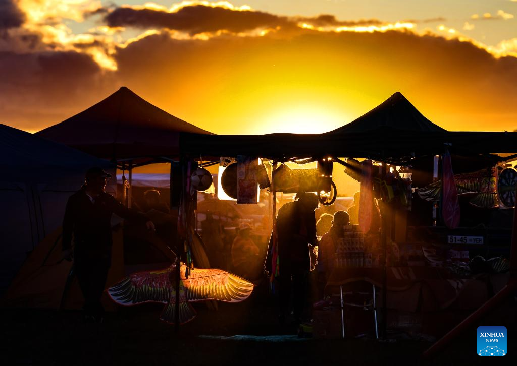 A souvenir shop is still open at sunset in the Nalaikh District of Ulan Bator, Mongolia, on Aug. 18, 2023. The Nalaikh District, the venue of a cultural festival to promote Mongolia's nomadic intangible culture and the development of the tourism sector, returns to its natural tranquility as the day-time events concluded at sunset. Some participants choose to stay put and wait for pleasure on the next day, while the others drive on their way to the downtown area of Ulan Bator or nearby grazing sites. Herdsmen are gathering their horses before going home, but the children, inexhaustible as they always are, still vie to have as much fun as they can before it gets dark. (Xinhua/Lan Hongguang)