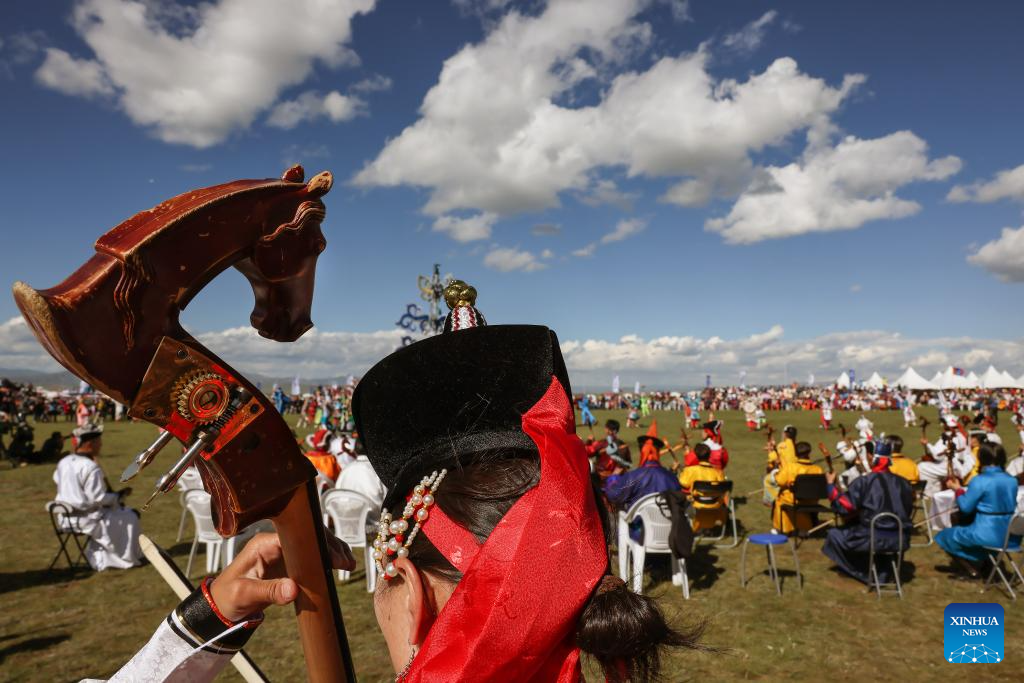 An artist plays the horse-headed-fiddle at the opening ceremony of a cultural festival in the Nalaikh District of Ulan Bator, Mongolia, on Aug. 18, 2023. A cultural festival to promote Mongolia's nomadic intangible culture and the development of the tourism sector kicked off here on Friday.