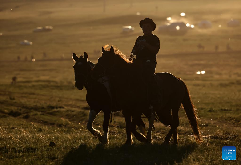 A herdsman is pictured on his way home in the Nalaikh District of Ulan Bator, Mongolia, on Aug. 18, 2023. The Nalaikh District, the venue of a cultural festival to promote Mongolia's nomadic intangible culture and the development of the tourism sector, returns to its natural tranquility as the day-time events concluded at sunset. Some participants choose to stay put and wait for pleasure on the next day, while the others drive on their way to the downtown area of Ulan Bator or nearby grazing sites. Herdsmen are gathering their horses before going home, but the children, inexhaustible as they always are, still vie to have as much fun as they can before it gets dark. (Xinhua/Lan Hongguang)