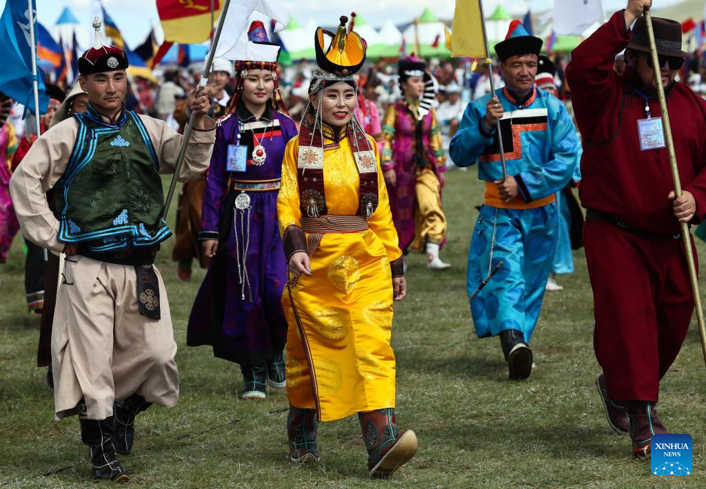 People attend the opening ceremony of a cultural festival in the Nalaikh District of Ulan Bator, Mongolia, on Aug. 18, 2023. A cultural festival to promote Mongolia's nomadic intangible culture and the development of the tourism sector kicked off here on Friday.