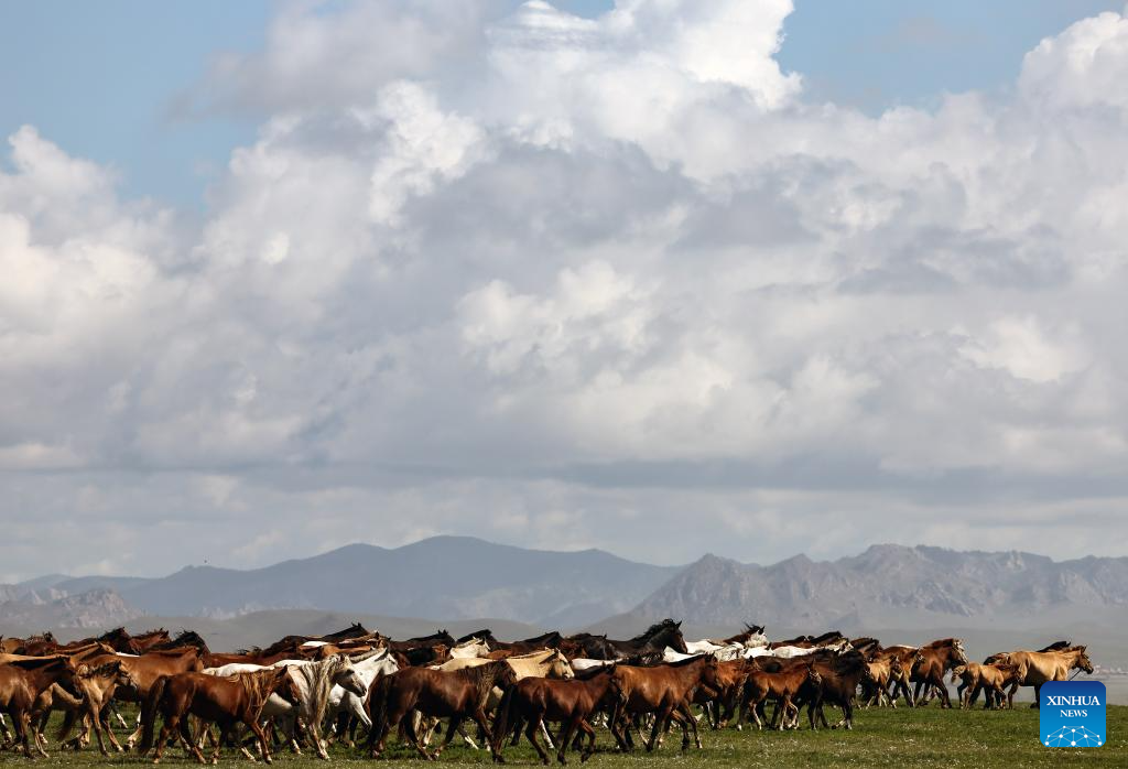 Race horses are pictured at a cultural festival in the Nalaikh District of Ulan Bator, Mongolia, on Aug. 18, 2023. A cultural festival to promote Mongolia's nomadic intangible culture and the development of the tourism sector kicked off here on Friday.