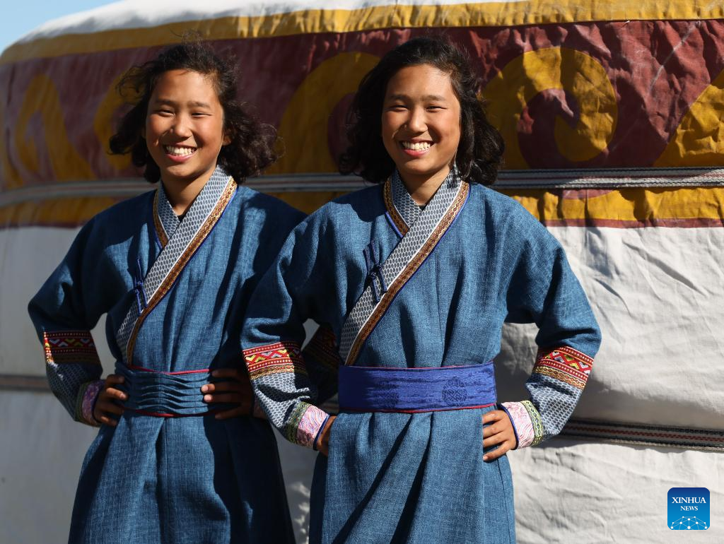 Mongolian twins are pictured at a cultural festival in the Nalaikh District of Ulan Bator, Mongolia, on Aug. 19, 2023. A cultural festival to promote Mongolia's nomadic intangible culture and the development of the tourism sector kicked off here on Friday.