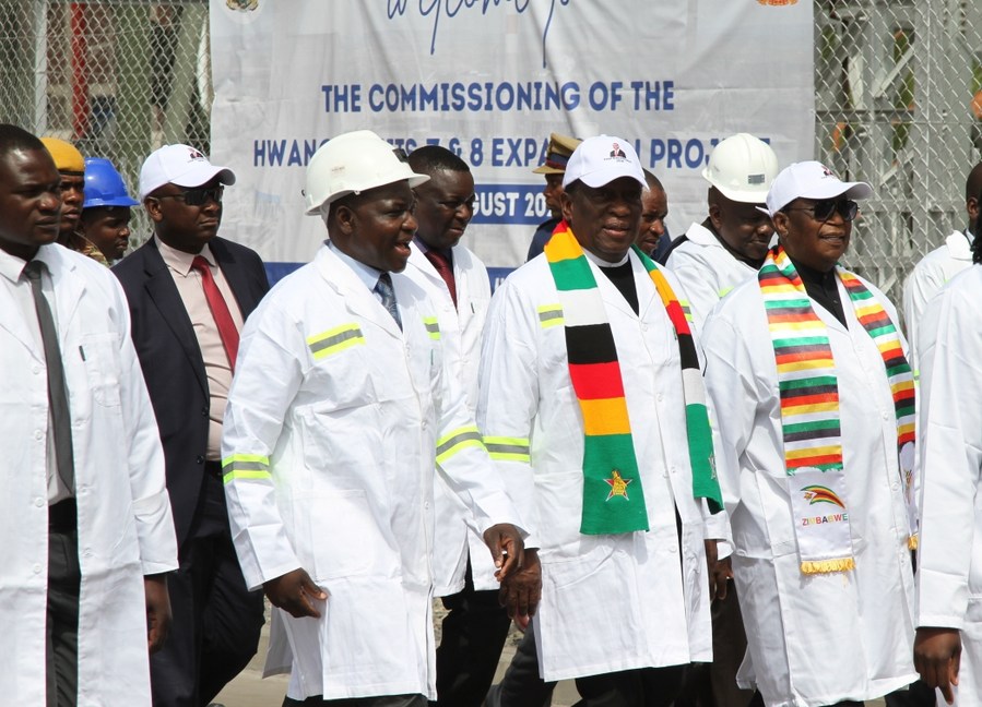 Zimbabwean President Emmerson Mnangagwa (2nd R, front) arrives for the commissioning ceremony of the Hwange Thermal Power Station expansion project in Hwange, Zimbabwe, on Aug. 3, 2023. (Photo by Tafara Mugwara/Xinhua)
