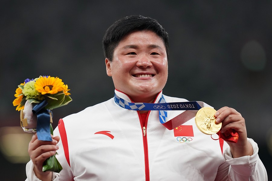 Gong Lijiao of China reacts during the award ceremony of the women's shot put at the Tokyo 2020 Olympic Games in Tokyo, Japan on Aug. 1, 2021. (Xinhua/Ju Huanzong)