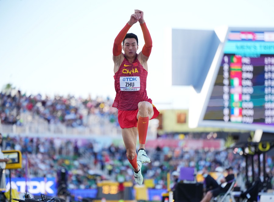 China's Zhu Yaming competes during the men's triple jump final at the World Athletics Championships Oregon22 in Eugene, Oregon, the United States on July 23, 2022. (Xinhua/Wu Xiaoling)
