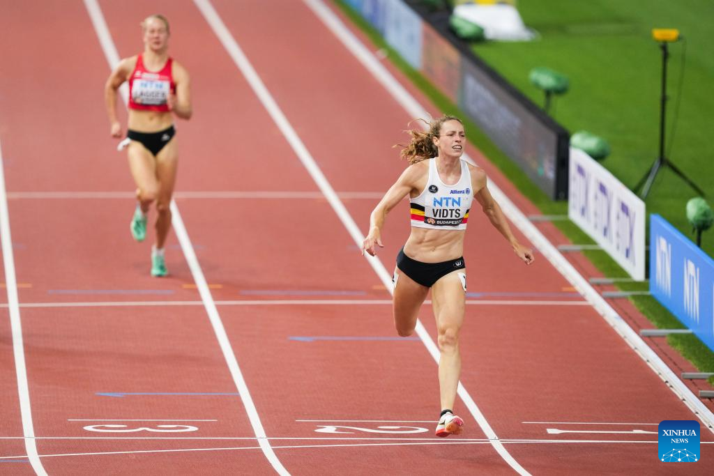 Noor Vidts (R) of Belgium competes during the 200m of Women's Heptathlon at the World Athletics Championships Budapest 2023 in Budapest, Hungary on Aug. 19, 2023. (Xinhua/Zheng Huansong)