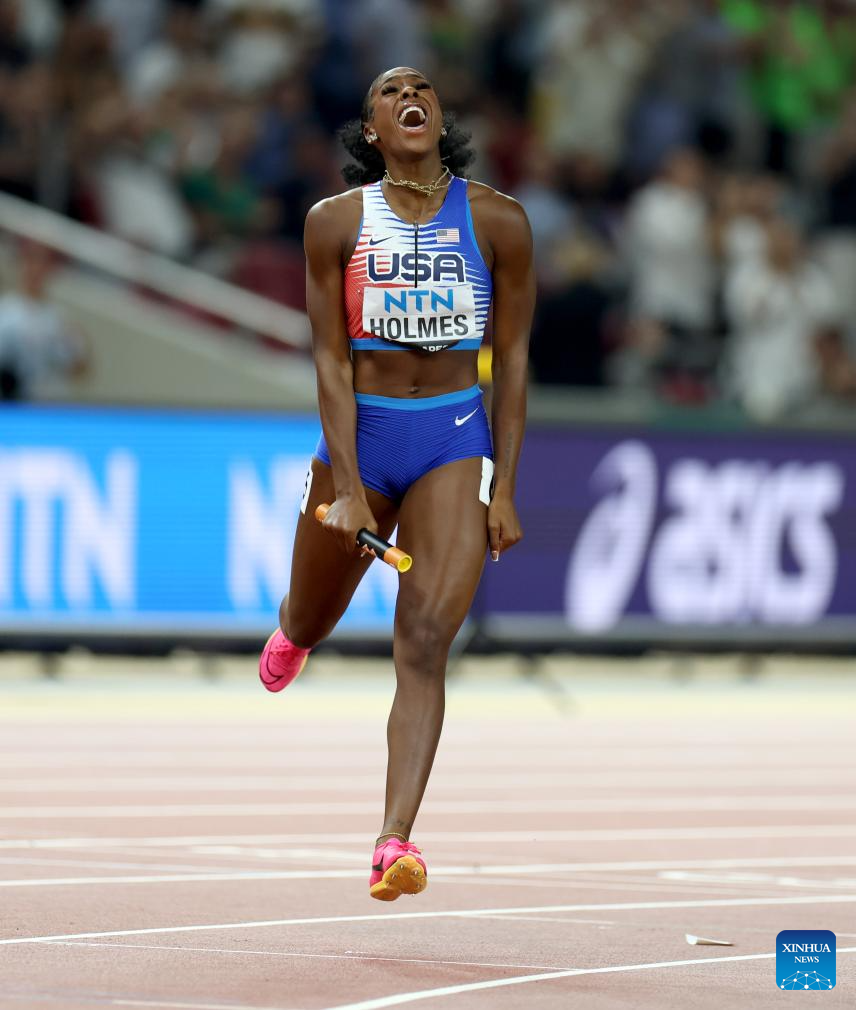 Alexis Holmes of the United States celebrates after the 4x400m Relay Mixed Final of the World Athletics Championships Budapest 2023 in Budapest, Hungary on Aug. 19, 2023. (Xinhua/Li Ying)