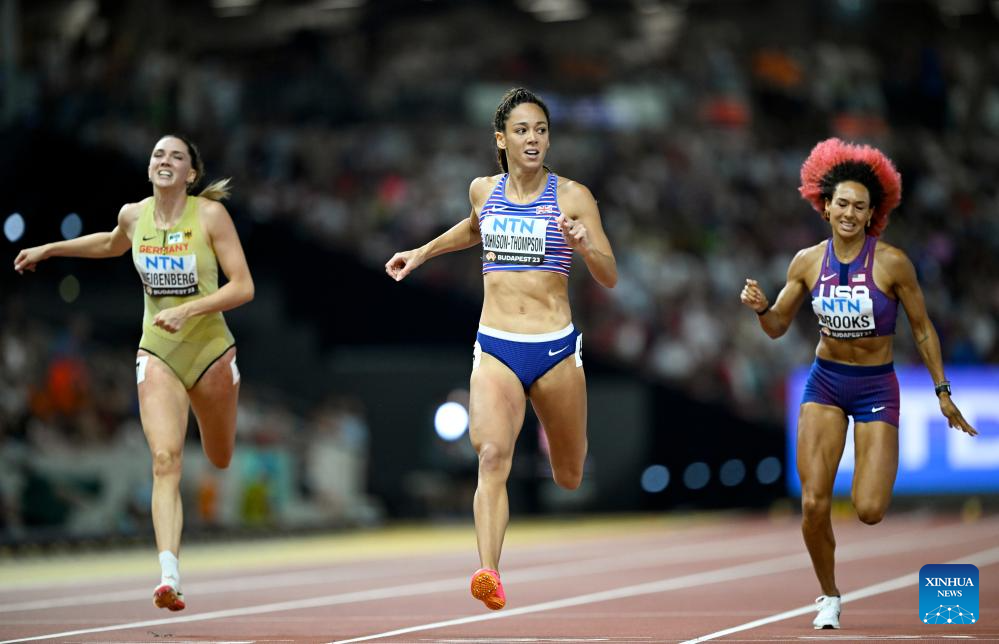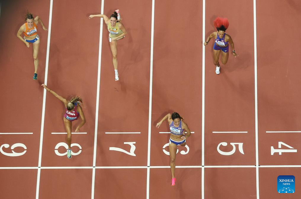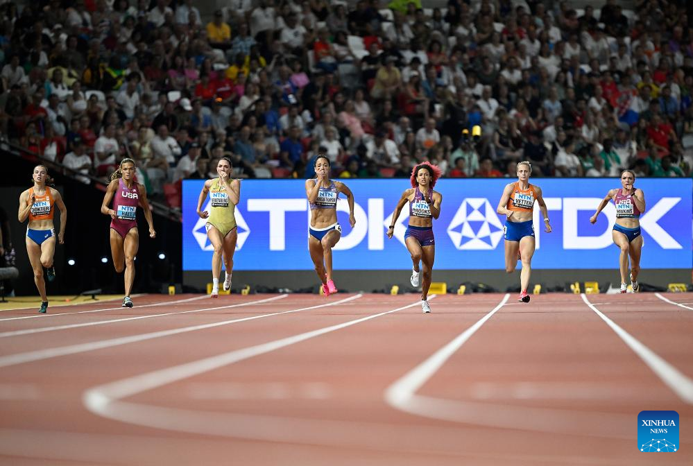 Taliyah Brooks (C) of the United States competes during the 200m of Women's Heptathlon at the World Athletics Championships Budapest 2023 in Budapest, Hungary on Aug. 19, 2023. (Xinhua/Song Yanhua)
