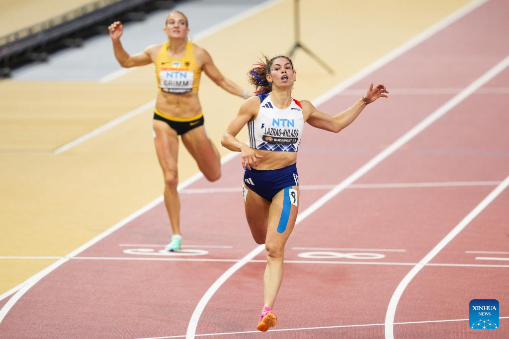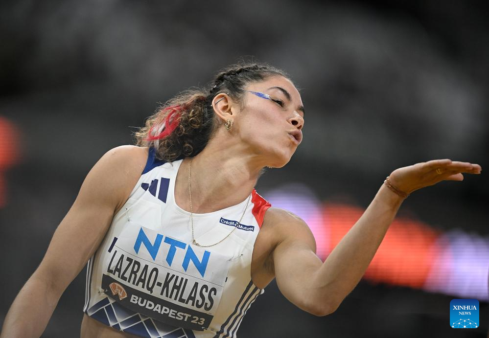 Auriana Lazraq-Khlass (R) of France reacts after the 200m of Women's Heptathlon at the World Athletics Championships Budapest 2023 in Budapest, Hungary on Aug. 19, 2023. (Xinhua/Zheng Huansong)