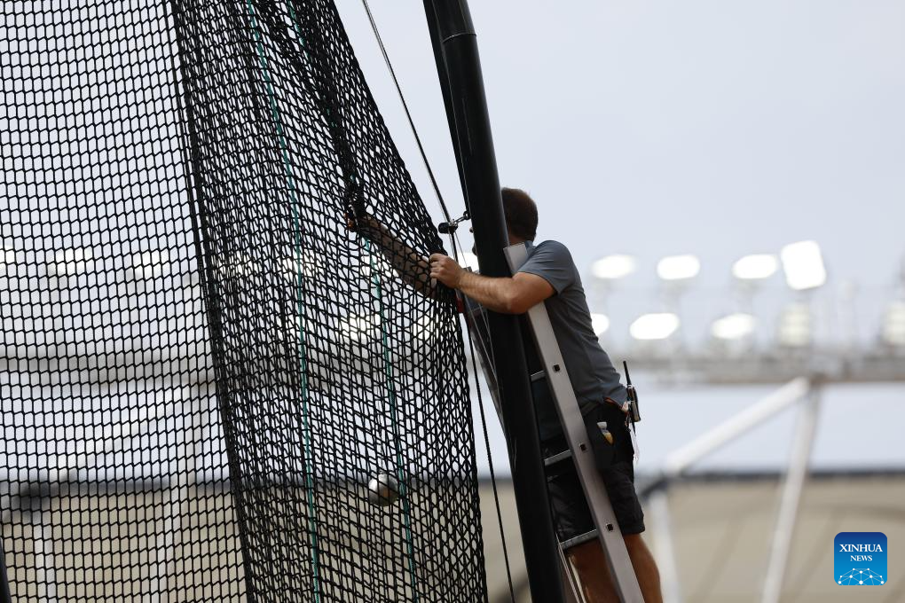 Staff takes the hammer down from the net during the Men's Hammer Throw Qualifications of the World Athletics Championships Budapest 2023 at the National Athletics Centre stadium in Budapest, Hungary on Aug. 19, 2023. (Xinhua/Wang Lili)
