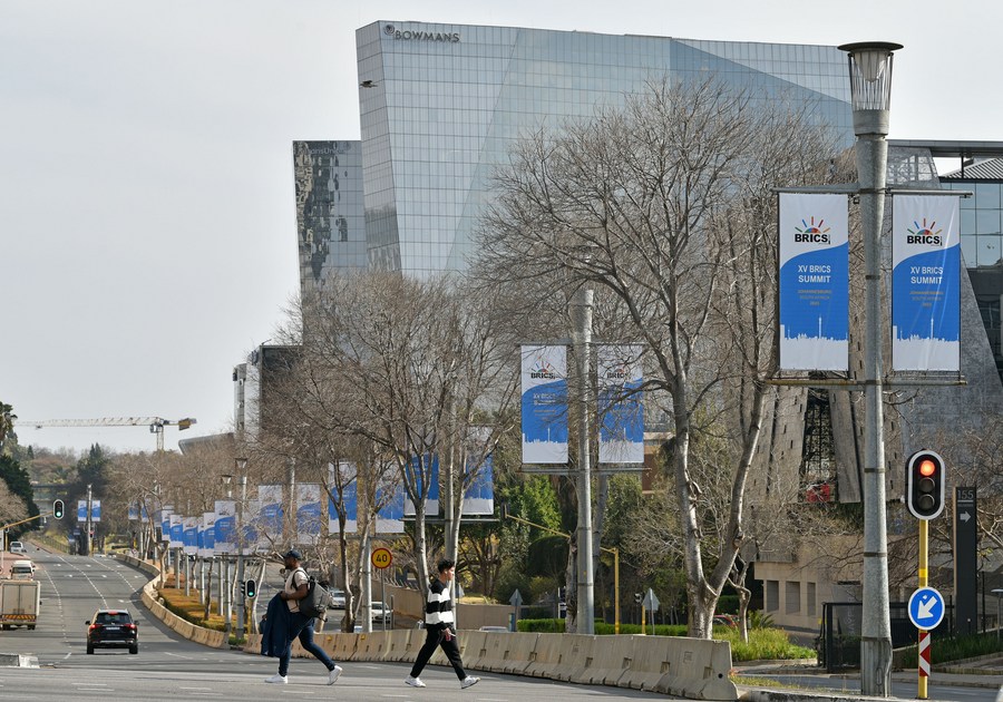Signboards of the 15th BRICS Summit are seen in a street of Johannesburg, South Africa, Aug. 17, 2023. (Xinhua/Chen Cheng)